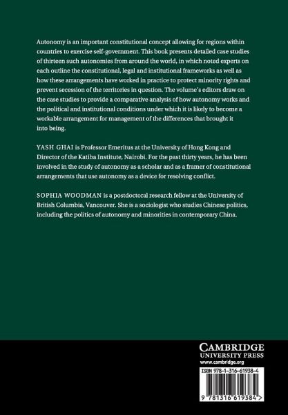 Introduction: nature and origins of autonomy Yash Ghai; 1. Seeking autonomy in a decentralised federation: the case of Québec Richard Simeon and Luc Turgeon; 2. Property and happiness through autonomy: the self-government of the Åland Islands in Finland Markku Suksi; 3. Puerto Rico: autonomy or colonial subordination? Efrén Rivera-Ramos; 4. Foundations and institutions of South-Tyrol's autonomy in Italy Oskar Peterlini; 5. Kashmir: the vanishing autonomy Jill Cottrell; 6. Autonomies of scale: precarious self-government on Norfolk Island Helen Irving; 7. The autonomy of Catalonia: the unending search for a place within pluralist Spain Carlos Flores Juberías; 8. Zanzibar in Tanzania: from sovereign to autonomy? Yash Ghai; 9. Defective democracy in a failed state? Bridging constitutional design, politics and ethnic division in Bosnia-Herzegovina Josef Marko; 10. Hong Kong's autonomy: dialects of powers and institutions Yash Ghai; 11. The autonomy of devolved Scotland Chris Himsworth; 12. Macau: transformation of a historic autonomy Paulo Cardinal; 13. Autonomy and conflict resolution in Bougainville, Papua New Guinea Anthony J. Regan; 14. Comparative perspectives on institutional frameworks for autonomy Sophia Woodman and Yash Ghai.