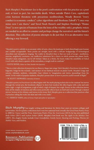Rich Murphy's Practitioner Joy is the poet's confrontation with his practice as a poet and, at least in part, his inevitable death. When outside Plato's Cave, capitalism's crisis horizon threatens with precarious neoliberalism, Wendy Brown's "every conduct is economic conduct," cyber algorithms and Shoshana Zuboff's "I once was mine; now I am theirs," and Yuval Noah Harari's and Stephen Hawking's "Homo Deus" (a new species of humans from the loins of the wealthy only), prophetic voices are needed in an effort to counter and perhaps change the narrative's and the future's direction. This collection of poems attempts to do just that. It is an alternative voice offering a way forward.