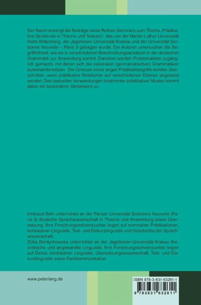 Irmtraud Behr unterrichtet an der Pariser Universität Sorbonne Nouvelle ¿ Paris 3 deutsche Sprachwissenschaft in Theorie und Anwendung sowie Übersetzung. Ihre Forschungsschwerpunkte liegen auf nominalen Prädikationen, kontrastiver Linguistik, Text- und Diskurslinguistik und Geschichte der Sprachwissenschaft. Zofia Berdychowska unterrichtet an der Jagellonen-Universität Krakau theoretische und angewandte Linguistik. Ihre Forschungsschwerpunkte liegen auf Deixis, kontrastiver Linguistik, Übersetzungswissenschaft, Text- und Diskurslinguistik sowie Fachkommunikation.