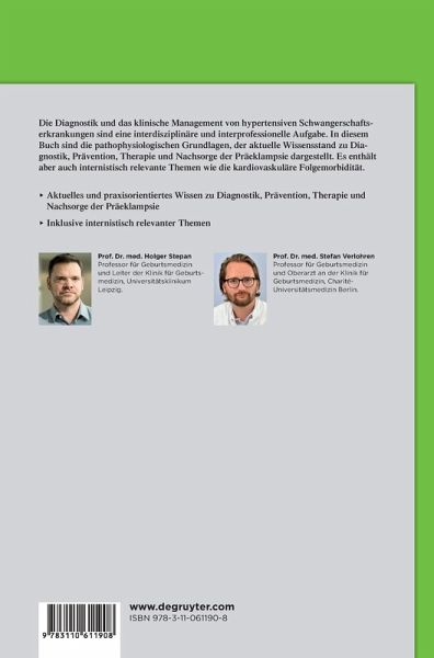 Die Diagnostik und das klinische Management von hypertensiven Schwangerschaftserkrankungen sind eine interdisziplinäre und interprofessionelle Aufgabe. In diesem Buch sind die pathophysiologischen Grundlagen, der aktuelle Wissensstand zur Diagnostik, Prävention und Therapie als auch Aspekte der Nachsorge der Präeklampsie dargestellt. Das Buch richtet sich an alle geburtsmedizinischen Professionen, enthält aber auch weiterführende Themen wie die kardiovaskuläre Folgemorbidität.
