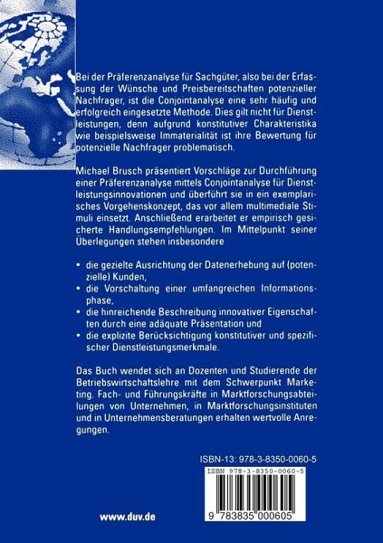 Michael Brusch präsentiert Vorschläge zur Durchführung einer Präferenzanalyse mittels Conjointanalyse für Dienstleistungsinnovationen und überführt sie in ein exemplarisches Vorgehenskonzept, das vor allem multimediale Stimuli einsetzt. Anschließend erarbeitet er empirisch gesicherte Handlungsempfehlungen. Im Mittelpunkt seiner Überlegungen stehen insbesondere