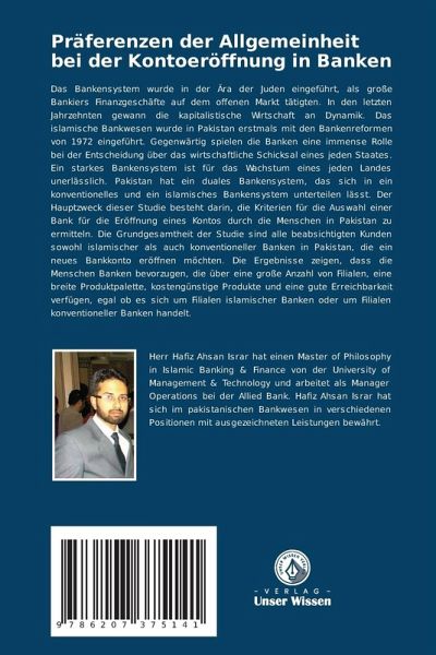 Das Bankensystem wurde in der Ära der Juden eingeführt, als große Bankiers Finanzgeschäfte auf dem offenen Markt tätigten. In den letzten Jahrzehnten gewann die kapitalistische Wirtschaft an Dynamik. Das islamische Bankwesen wurde in Pakistan erstmals mit den Bankenreformen von 1972 eingeführt. Gegenwärtig spielen die Banken eine immense Rolle bei der Entscheidung über das wirtschaftliche Schicksal eines jeden Staates. Ein starkes Bankensystem ist für das Wachstum eines jeden Landes unerlässlich. Pakistan hat ein duales Bankensystem, das sich in ein konventionelles und ein islamisches Bankensystem unterteilen lässt. Der Hauptzweck dieser Studie besteht darin, die Kriterien für die Auswahl einer Bank für die Eröffnung eines Kontos durch die Menschen in Pakistan zu ermitteln. Die Grundgesamtheit der Studie sind alle beabsichtigten Kunden sowohl islamischer als auch konventioneller Banken in Pakistan, die ein neues Bankkonto eröffnen möchten. Die Ergebnisse zeigen, dass die MenschenBanken bevorzugen, die über eine große Anzahl von Filialen, eine breite Produktpalette, kostengünstige Produkte und eine gute Erreichbarkeit verfügen, egal ob es sich um Filialen islamischer Banken oder um Filialen konventioneller Banken handelt.
