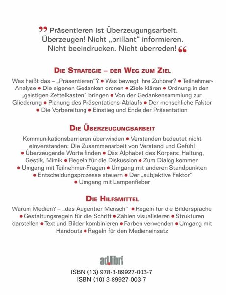 Präsentieren ist Überzeugungsarbeit! Jeder Praktiker weiß: Es ist viel leichter, ein Konzept zu erarbeiten, als die Realisierung auch durchzusetzen. Ein Geheimnis der Durchsetzung von Ideen, Konzepten und Arbeitsergebnissen liegt in der gelungenen Präsentation. Hier entscheidet sich oft innerhalb einer Stunde, ob ein Ergebnis, das in Wochen oder Monaten erarbeitet wurde, ankommt oder durchfällt. Dieses Buch bewahrt Sie davor, auf dem Weg zu einer wirklich guten Präsentation die falschen Schritte zu tun ¿ sich entweder mit Fakten vollzustopfen oder einen Rhetorik-Kurs zu besuchen, bevor Sie sich an eine Präsentation heranwagen! Die Autoren zeigen Ihnen, wie Sie mit einfachen Mitteln Ihre Ideen wirksam verkaufen, wie Sie Fakten und Ergebnisse kurz und bündig, logisch und konsequent, leicht und verständlich und vor allem entscheidungsreif präsentieren können, und wie Sie Ihre Präsentationen, Vorträge und Verkaufsgespräche durch moderne Kommunikations- und Visualisierungstechniken nachhaltig unterstützen. Aus dem Inhalt: Wie Sie Präsentationen planen und vorbereiten. - Wie Sie unterschiedliche Zielgruppen wirkungsvoll ansprechen. - Wie Sie mit den Reaktionen der Zuhörer effektiv umgehen. - Wie Sie Ihre Vorschläge anschaulich und entscheidungsreif gestalten. - Wie Sie dabei Medien wirkungsvoll einsetzen.