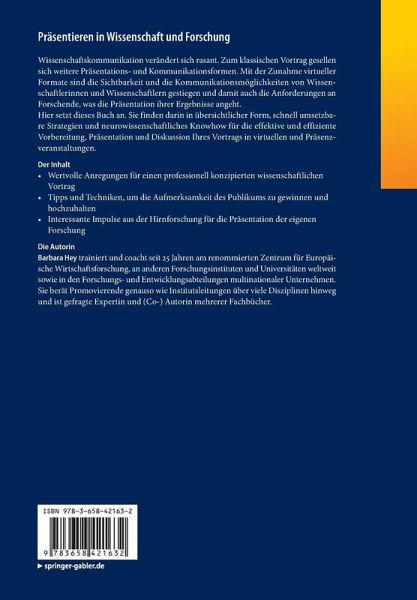 Wissenschaftskommunikation verändert sich rasant. Zum klassischen Vortrag gesellen sich weitere Präsentations- und Kommunikationsformen. Mit der Zunahme virtueller Formate sind die Sichtbarkeit und die Kommunikationsmöglichkeiten von Wissenschaftlerinnen und Wissenschaftlern gestiegen und damit auch die Anforderungen an Forschende, was die Präsentation ihrer Ergebnisse angeht.Hier setzt dieses Buch an. Sie finden darin in übersichtlicher Form, schnell umsetzbare Strategien und neurowissenschaftliches Knowhow für die effektive und effiziente Vorbereitung, Präsentation und Diskussion Ihres Vortrags in virtuellen und Präsenzveranstaltungen.