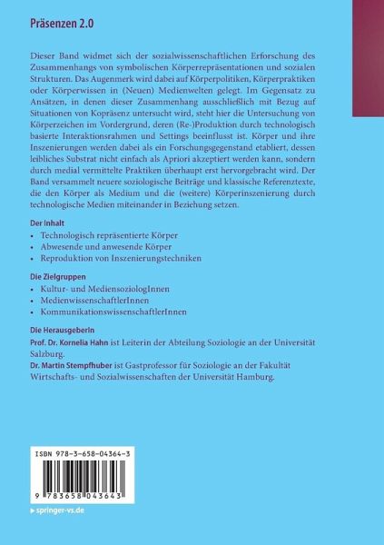 Dieser Band widmet sich der sozialwissenschaftlichen Erforschung des Zusammenhangs von symbolischen Körperrepräsentationen und sozialen Strukturen. Das Augenmerk wird dabei auf Körperpolitiken, Körperpraktiken oder Körperwissen in (Neuen) Medienwelten gelegt. Im Gegensatz zu Ansätzen, in denen dieser Zusammenhang ausschließlich mit Bezug auf Situationen von Kopräsenz untersucht wird, steht hier die Untersuchung von Körperzeichen im Vordergrund, deren (Re-)Produktion durch technologisch basierte Interaktionsrahmen und Settings beeinflusst ist. Körper und ihre Inszenierungen werden dabei als ein Forschungsgegenstand etabliert, dessen leibliches Substrat nicht einfach als Apriori akzeptiert werden kann, sondern durch medial vermittelte Praktiken überhaupt erst hervorgebracht wird. Der Band versammelt neuere soziologische Beiträge und klassische Referenztexte, die den Körper als Medium und die (weitere) Körperinszenierung durch technologische Medien miteinander in Beziehung setzen.