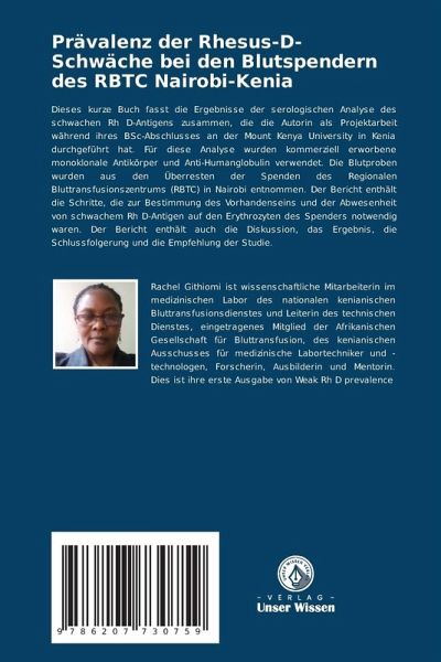 Dieses kurze Buch fasst die Ergebnisse der serologischen Analyse des schwachen Rh D-Antigens zusammen, die die Autorin als Projektarbeit während ihres BSc-Abschlusses an der Mount Kenya University in Kenia durchgeführt hat. Für diese Analyse wurden kommerziell erworbene monoklonale Antikörper und Anti-Humanglobulin verwendet. Die Blutproben wurden aus den Überresten der Spenden des Regionalen Bluttransfusionszentrums (RBTC) in Nairobi entnommen. Der Bericht enthält die Schritte, die zur Bestimmung des Vorhandenseins und der Abwesenheit von schwachem Rh D-Antigen auf den Erythrozyten des Spenders notwendig waren. Der Bericht enthält auch die Diskussion, das Ergebnis, die Schlussfolgerung und die Empfehlung der Studie.