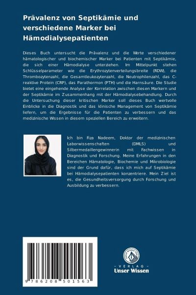 Dieses Buch untersucht die Prävalenz und die Werte verschiedener hämatologischer und biochemischer Marker bei Patienten mit Septikämie, die sich einer Hämodialyse unterziehen. Im Mittelpunkt stehen Schlüsselparameter wie die Erythrozytenverteilungsbreite (RDW), die Thrombozytenzahl, die Gesamtleukozytenzahl, die Neutrophilenzahl, das C-reaktive Protein (CRP), das Parathormon (PTH) und die Harnsäure. Die Studie bietet eine eingehende Analyse der Korrelation zwischen diesen Markern und der Septikämie im Zusammenhang mit der Hämodialysebehandlung. Durch die Untersuchung dieser kritischen Marker soll dieses Buch wertvolle Einblicke in die Diagnostik und das klinische Management von Septikämie liefern, um die Ergebnisse für die Patienten zu verbessern und das medizinische Wissen in diesem speziellen Bereich zu erweitern.