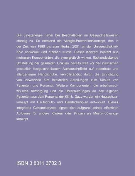 In diesem Buch wird ein Allergie-Präventionskonzept vorgestellt, das in der Zeit von 1996 bis Ende 2001 von mir an der Universitätsklinik Köln entwickelt und etabliert wurde und sich in kontinuierlicher Weiterentwicklung befindet. Dieses Konzept besteht aus mehreren Komponenten, die synergistisch wirken. Es eignete sich aufgrund seines klaren und effektiven Aufbaues zur Verhütung der durch die Typ-I-Allergie gegen Naturgummi bedingten Haut- und Schleimhauterkrankungen an der Universitätsklinik Köln. Darüber hinaus ist es in der beschriebenen oder in abgewandelter Form auf andere Kliniken und Praxen mit arbeitsmedizinischen Problemen in diesem Bereich als Muster-Lösungskonzept übertragbar.