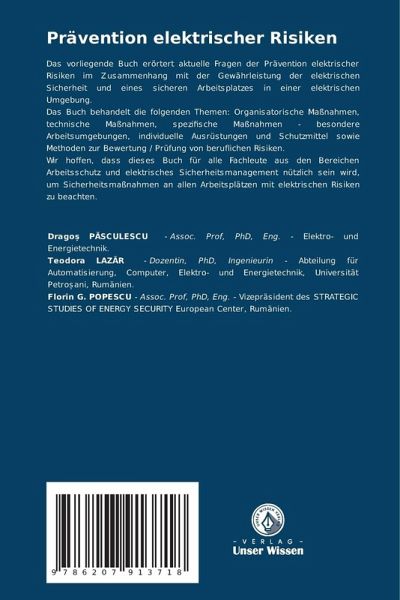 Das vorliegende Buch erörtert aktuelle Fragen der Prävention elektrischer Risiken im Zusammenhang mit der Gewährleistung der elektrischen Sicherheit und eines sicheren Arbeitsplatzes in einer elektrischen Umgebung.Das Buch behandelt die folgenden Themen: Organisatorische Maßnahmen, technische Maßnahmen, spezifische Maßnahmen - besondere Arbeitsumgebungen, individuelle Ausrüstungen und Schutzmittel sowie Methoden zur Bewertung / Prüfung von beruflichen Risiken.Wir hoffen, dass dieses Buch für alle Fachleute aus den Bereichen Arbeitsschutz und elektrisches Sicherheitsmanagement nützlich sein wird, um Sicherheitsmaßnahmen an allen Arbeitsplätzen mit elektrischen Risiken zu beachten.