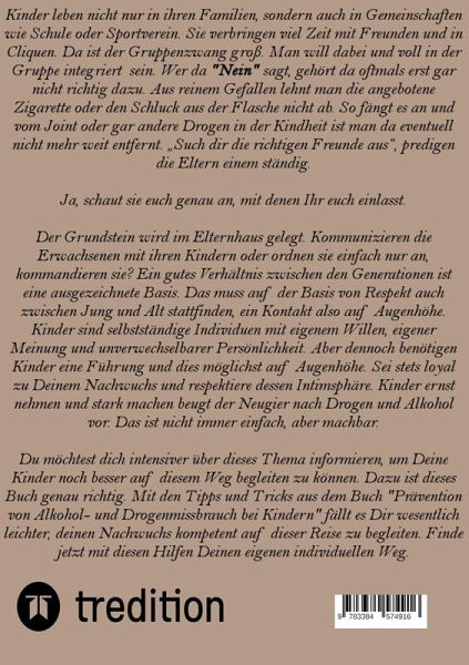 Du möchtest dich intensiver über dieses Thema informieren, um Deine Kinder noch besser auf diesem Weg begleiten zu können. Dazu ist dieses ebook genau richtig. Mit den Tipps und Tricks aus dem Buch "Prävention von Alkohol- und Drogenmissbrauch bei Kindern" fällt es Dir wesentlich leichter, deinen Nachwuchs kompetent auf dieser Reise zu begleiten. Finde jetzt mit diesen Hilfen Deinen eigenen individuellen Weg.
