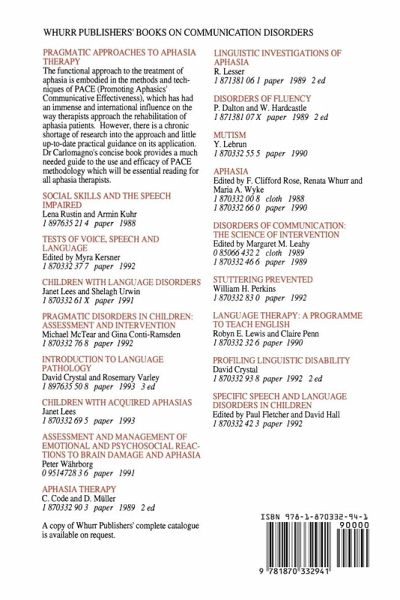The functional approach to the treatment of aphasia is embodied in the methods and techniques of Promoting Aphasic's Communicative Effectiveness (PACE), which has had an international influence on the way therapists approach the rehabilitation of aphasia patients. However, there is a shortage of research into the approach and little up-to-date practical guidance on its application. D. Carlomagno's concise book aims to provide a guide to the use and efficacy of PACE methodology which should be useful for aphasia therapists.