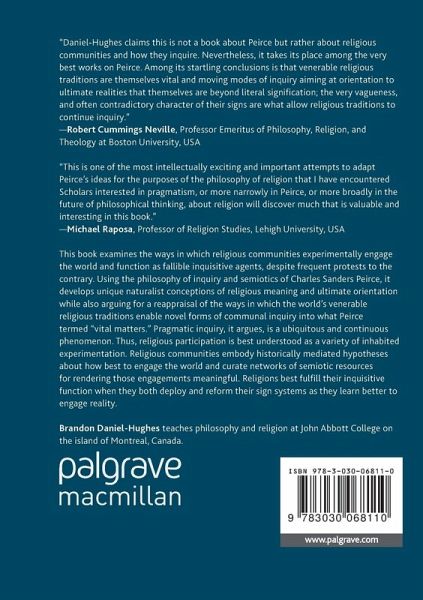 This book examines the ways in which religious communities experimentally engage the world and function as fallible inquisitive agents, despite frequent protests to the contrary. Using the philosophy of inquiry and semiotics of Charles Sanders Peirce, it develops unique naturalist conceptions of religious meaning and ultimate orientation while also arguing for a reappraisal of the ways in which the world's venerable religious traditions enable novel forms of communal inquiry into what Peirce termed "vital matters." Pragmatic inquiry, it argues, is a ubiquitous and continuous phenomenon. Thus, religious participation, though cautiously conservative in many ways, is best understood as a variety of inhabited experimentation. Religious communities embody historically mediated hypotheses about how best to engage the world and curate networks of semiotic resources for rendering those engagements meaningful. Religions best fulfill their inquisitive function when they both deploy and reform their sign systems as they learn better to engage reality.