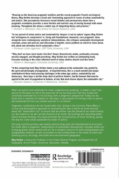 What can justice and sustainability mean, pragmatically speaking, in today's cities? Can justice be the basis on which the practices of city building rely? Can this recognition constitute sustainability in city building, from a pragmatic perspective? Today, we are faced with a mountain of reasons to lose hope in any prospect of moving closer to justice and sustainability from our present position in civilization. Pragmatic Justifications for the Sustainable City: Acting in the Common Place offers a critical and philosophical approach to revaluating the way in which we think and talk about the "sustainable city" to ensure that we neither lose the thread of our urban history, nor the means to live well amidst diversity of all kinds. By building and rebuilding better habits of urban thinking, this book promotes the reconstruction of moral thinking, paving the way for a new urban sustainability model of justice. Utilizing multidisciplinary case studies and building upon anti-foundationalist principles, this book offers a pragmatic interpretation of sustainable development concepts within our emerging global urban context and will be a valuable resource for both undergraduate and postgraduate students, as well as academics and professionals in the areas of urban and planning policy, sociology, and urban and environmental geography.