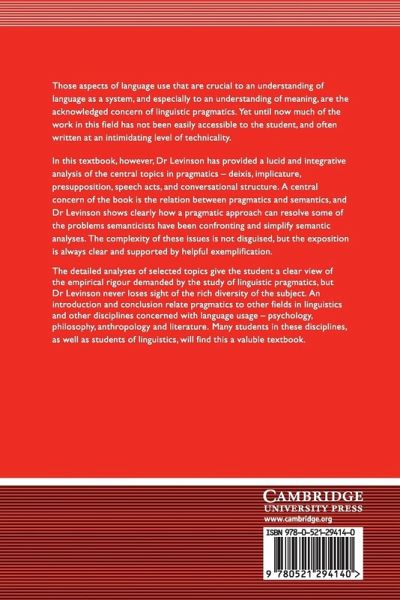 Those aspects of language use that are crucial to an understanding of language as a system, and especially to an understanding of meaning, are the acknowledged concern of linguistic pragmatics. This textbook provides a lucid and integrative analysis of the central topics in pragmatics - deixis, implicature, presupposition, speech acts, and conversational structure. A central concern of the book is the relation between pragmatics and semantics, and Dr Levinson shows clearly how a pragmatic approach can resolve some of the problems semantics have been confronting and simplifying semantic analyses. The exposition is always clear and supported by helpful exemplification. The detailed analyses of selected topics give the student a clear view of the empirical rigour demanded by the study of linguistic pragmatics, but Dr Levinson never loses sight of the rich diversity of the subject. An introduction and conclusion relate pragmatics to other fields in linguistics and other disciplines concerned with language usage - psychology, philosophy, anthropology and literature.
