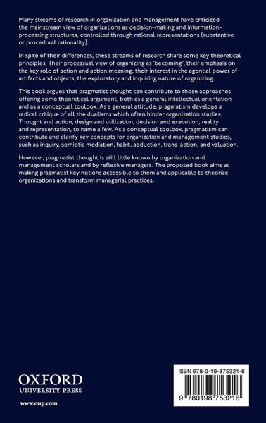 Many streams of research in organization and management have criticized the mainstream view of organizations as decision-making and information-processing structures, controlled through rational representations (substantive or procedural rationality). In spite of their differences, these streams of research share some key theoretical principles: Their processual view of organizing as 'becoming', their emphasis on the key role of action and action meaning; their interest in the agential power of artefacts and objects; the exploratory and inquiring nature of organizing. This book argues that Pragmatist thought can contribute to those approaches offering some theoretical argument, both as a general intellectual orientation and as a conceptual toolbox. As a general attitude, Pragmatism develops a radical critique of all the dualisms which often hinder organization studies: Thought and action, design and utilization, decision and execution, reality and representation, to name a few. As a conceptual toolbox, Pragmatism can contribute and clarify key concepts for organization and management studies, such as inquiry, semiotic mediation, habit, abduction, trans-action, and valuation. However, Pragmatist thought is still little known by organization and management scholars and by reflexive managers. The proposed book aims at making pragmatist key notions accessible to them and applicable to theorize organizations and transform managerial practices.