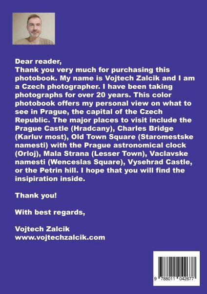 Dear reader, Thank you very much for purchasing this photobook. My name is Vojtech Zalcik and I am a Czech photographer. I have been taking photographs for over 20 years. This color photobook offers my personal view on what to see in Prague, the capital of the Czech Republic. The major places to visit include the Prague Castle (Hradcany), Charles Bridge (Karluv most), Old Town Square (Staromestske namesti) with the Prague astronomical clock (Orloj), Mala Strana (Lesser Town), Vaclavske namesti (Wenceslas Square), Vysehrad Castle, or the Petrin hill. The book contains 244 color photographs with subtitles and I hope that you will find the insipiration for your visit inside. Thank you! With best regards, Vojtech Zalcik