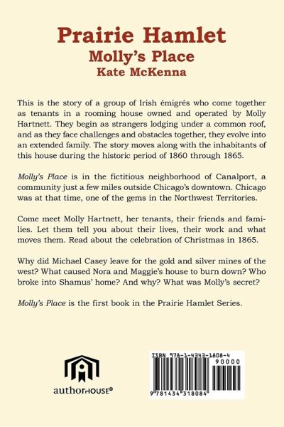 Molly's Place is the first book in the Prairie Hamlet Series. This is the story of a the tenants in a rooming house owned by Molly Hartnett. They begin as strangers lodging under a common roof and through the challenges and obstacles that affect their members; they evolve into an extended family. The story takes place in the fictitious neighborhood of Canalport, a small township adjacent to Chicago, within the Northwest Territories, from the fall of 1860 through New Year's Eve, 1865. Although the book is a historical romance novel, the characters drive the story, not the historical period in which they live. The book is regional in its presentation, it's similar to the regionality of Sarah, Plain and Tall, Anne of Green Gables, Brighton Beach Memoirs, A Tree Grows in Brooklyn, The Ice Palace (Alaska), Giant (Texas).