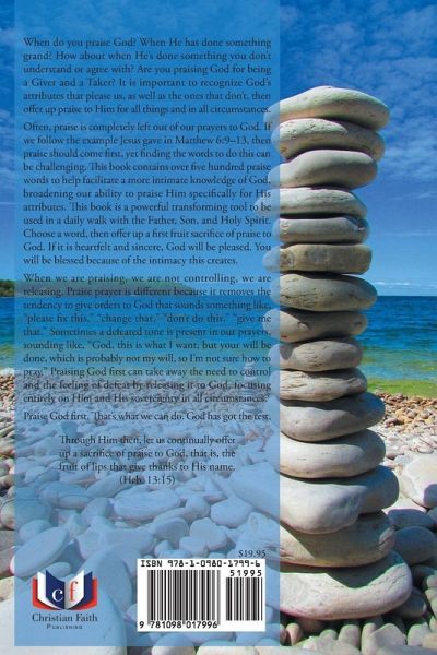 When do you praise God? When He has done something grand? How about when He's done something you don't understand or agree with? Are you praising God for being a Giver and a Taker? It is important to recognize God's attributes that please us, as well as the ones that don't, then offer up praise to Him for all things and in all circumstances. Often, praise is completely left out of our prayers to God. If we follow the example Jesus gave in Matthew 6:9-13, then praise should come first, yet finding the words to do this can be challenging. This book contains over five hundred praise words to help facilitate a more intimate knowledge of God, broadening our ability to praise Him specifically for His attributes. This book is a powerful transforming tool to be used in a daily walk with the Father, Son, and Holy Spirit. Choose a word, then offer up a first fruit sacrifice of praise to God. If it is heartfelt and sincere, God will be pleased. You will be blessed because of the intimacy this creates. When we are praising, we are not controlling, we are releasing. Praise prayer is different because it removes the tendency to give orders to God that sounds something like, "please fix this," "change that," "don't do this," "give me that." Sometimes a defeated tone is present in our prayers, sounding like, "God, this is what I want, but your will be done, which is probably not my will, so I'm not sure how to pray." Praising God first can take away the need to control and the feeling of defeat by releasing it to God, focusing entirely on Him and His sovereignty in all circumstances. Praise God first. That's what we can do. God has got the rest. Through Him then, let us continually offer up a sacrifice of praise to God, that is, the fruit of lips that give thanks to His name. (Heb. 13:15)