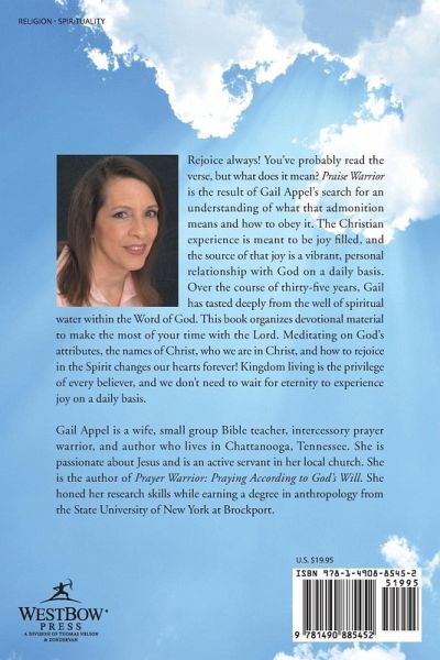 Rejoice always! You've probably read the verse, but what does it mean? Praise Warrior is the result of Gail Appel's search for an understanding of what that admonition means and how to obey it. The Christian experience is meant to be joy filled, and the source of that joy is a vibrant, personal relationship with God on a daily basis. Over the course of thirty-five years, Gail has tasted deeply from the well of spiritual water within the Word of God. This book organizes devotional material to make the most of your time with the Lord. Meditating on God's attributes, the names of Christ, who we are in Christ, and how to rejoice in the Spirit changes our hearts forever! Kingdom living is the privilege of every believer, and we don't need to wait for eternity to experience joy on a daily basis.