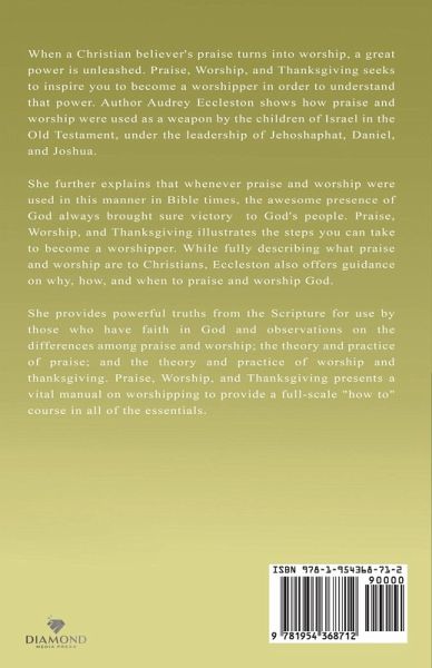 When a Christian believer's praise turns into worship, a great power is unleashed. Praise, Worship, and Thanksgiving seeks to inspire you to become a worshipper in order to understand that power. Author Audrey Eccleston shows how praise and worship were used as a weapon by the children of Israel in the Old Testament, under the leadership of Jehoshaphat, Daniel, and Joshua. She further explains that whenever praise and worship were used in this manner in Bible times, the awesome presence of God always brought sure victory to God's people. Praise, Worship, and Thanksgiving illustrates the steps you can take to become a worshipper. While fully describing what praise and worship are to Christians, Eccleston also offers guidance on why, how, and when to praise and worship God. She provides powerful truths from the Scripture for use by those who have faith in God and observations on the differences among praise and worship; the theory and practice of praise; and the theory and practice of worship and thanksgiving. Praise, Worship and Thanksgiving presents a vital manual on worshipping to provide a full-scale "how to" course in all of the essentials.