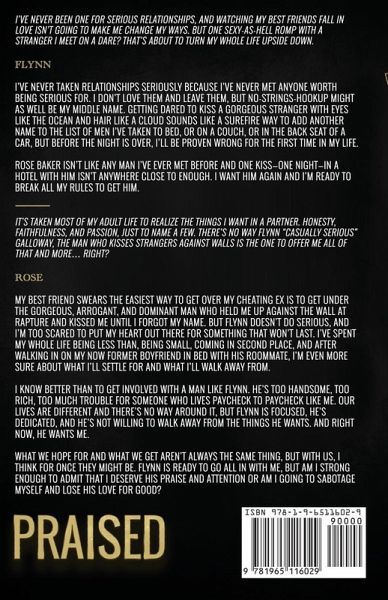 I've never been one for serious relationships, and watching my best friends fall in love isn't going to make me change my ways. But one sexy-as-hell romp with a stranger I meet on a dare? That's about to turn my whole life upside down. FLYNN I've never taken relationships seriously because I've never met anyone worth being serious for. I don't love them and leave them, but no-strings-hookup might as well be my middle name. Getting dared to kiss a gorgeous stranger with eyes like the ocean and hair like a cloud sounds like a surefire way to add another name to the list of men I've taken to bed, or on a couch, or in the back seat of a car, but before the night is over, I'll be proven wrong for the first time in my life. Rose Baker isn't like any man I've ever met before and one kiss-one night-in a hotel with him isn't anywhere close to enough. I want him again and I'm ready to break all my rules to get him. * * * It's taken most of my adult life to realize the things I want in a partner. Honesty, faithfulness, and passion, just to name a few. There's no way Flynn "Casually Serious" Galloway, the man who kisses strangers against walls is the one to offer me all of that and more... right? ROSE My best friend swears the easiest way to get over my cheating ex is to get under the gorgeous, arrogant, and dominant man who held me up against the wall at Rapture and kissed me until I forgot my name. But Flynn doesn't do serious, and I'm too scared to put my heart out there for something that won't last. I've spent my whole life being less than, being small, coming in second place, and after walking in on my now former boyfriend in bed with his roommate, I'm even more sure about what I'll settle for and what I'll walk away from. I know better than to get involved with a man like Flynn. He's too handsome, too rich, too much trouble for someone who lives paycheck to paycheck like me. Our lives are different and there's no way around it, but Flynn is focused, he's dedicated, and he's not willing to walk away from the things he wants. And right now, he wants me. What we hope for and what we get aren't always the same thing, but with us, I think for once they might be. Flynn is ready to go all in with me, but am I strong enough to admit that I deserve his praise and attention or am I going to sabotage myself and lose his love for good?