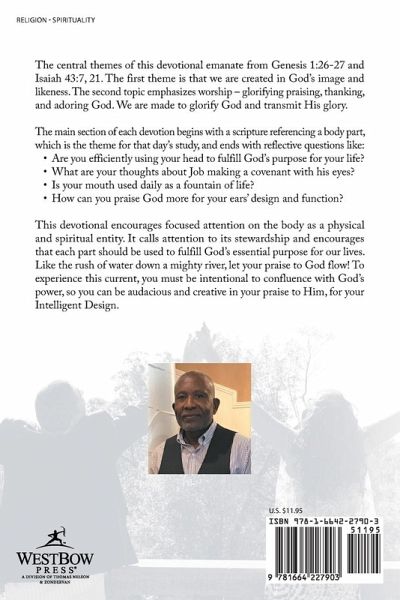 The central themes of this devotional emanate from Genesis 1:26-27 and Isaiah 43:7, 21. The first theme is that we are created in God's image and likeness. The second topic emphasizes worship - glorifying praising, thanking, and adoring God. We are made to glorify God and transmit His glory. The main section of each devotion begins with a scripture referencing a body part, which is the theme for that day's study, and ends with reflective questions like: Are you efficiently using your head to fulfill God's purpose for your life? What are your thoughts about Job making a covenant with his eyes? Is your mouth used daily as a fountain of life? How can you praise God more for your ears' design and function? This devotional encourages focused attention on the body as a physical and spiritual entity. It calls attention to its stewardship and encourages that each part should be used to fulfill God's essential purpose for our lives. Like the rush of water down a mighty river, let your praise to God flow! To experience this current, you must be intentional to confluence with God's power, so you can be audacious and creative in your praise to Him, for your Intelligent Design.