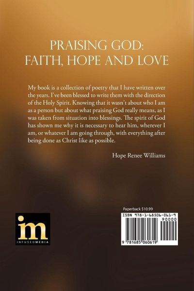 My book is a collection is a collection of poetry that I have written over the years. I've been blessed to write them with the direction of the Holy Spirit. Knowing that it wasn't about who I am as a person but about what praising God really means, as I was taken from situation into blessings. The spirit of God has shown me why it is necessary to hear him, wherever I am, or whatever I am going through, with everything after being done as Christ like as possible. -Hope Renee Williams