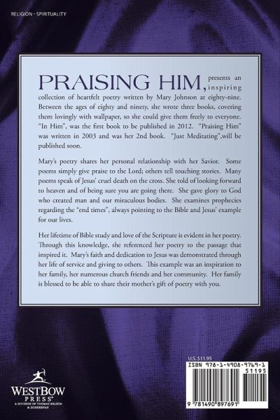 Praising Him presents an inspiring collection of heartfelt poetry written by Mary Johnson at age eighty-nine. Between the ages of eighty and ninety, she wrote three books, covering them lovingly with wallpaper so she could give them freely to everyone. In Him was the first book to be published in 2012. Praising Him was written in 2003 and was her second book. Just Meditating will be published soon. Mary’s poetry shared her personal relationship with her Savior. Some poems simply gave praise to the Lord. Many poems spoke of Jesus’s cruel death on the cross. She spoke of looking forward to heaven and of being sure you are going there. She gave glory to God who created man and our miraculous bodies. She examined prophecies regarding the end times, always pointing to the Bible and Jesus’s example for our lives. Her lifetime of Bible study and love of the scripture was evident in her poetry. Through this knowledge, she referenced her poetry to the passage that inspired it. Mary’s faith and dedication to her Savior was demonstrated through her life of service and giving to others. Her life was an inspiration to her family, her numerous church friends, and her community. Her family was blessed to be able to share their mother’s gift of poetry with you.