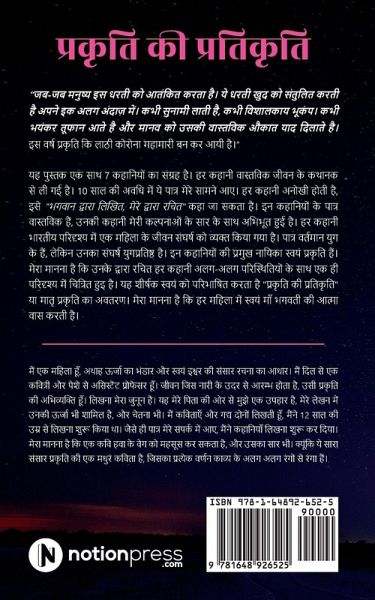 This is a book of compilation of few stories together with the plot of every story inspired by real life. These characters came across me over a period of 10 years. Each story is unique. One can even say "Written by God, narrated by me". All the characters in these stories are real, and are expressed with a pinch of my imagination. In every story, the struggle of the life of a woman is expressed in an Indian setting. The characters are from this era, but their struggle is the same. The leading lady of these stories--Mother Nature herself. Every story taken from Her is unique, plotted in the same scene, but with different circumstances. I believe that every woman has the soul of Mother Nature and the Title defines the embodiment of Mother Nature or Prakriti ki Pratikriti.