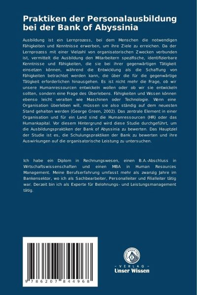 Ausbildung ist ein Lernprozess, bei dem Menschen die notwendigen Fähigkeiten und Kenntnisse erwerben, um ihre Ziele zu erreichen. Da der Lernprozess mit einer Vielzahl von organisatorischen Zwecken verbunden ist, vermittelt die Ausbildung den Mitarbeitern spezifische, identifizierbare Kenntnisse und Fähigkeiten, die sie bei ihrer gegenwärtigen Tätigkeit einsetzen können, während die Entwicklung als die Schaffung von Fähigkeiten betrachtet werden kann, die über die für die gegenwärtige Tätigkeit erforderlichen hinausgehen. Es ist nicht mehr die Frage, ob wir unsere Humanressourcen entwickeln wollen oder ob wir sie entwickeln sollten, sondern eine Frage des Überlebens. Fähigkeiten und Wissen können ebenso leicht veralten wie Maschinen oder Technologie. Wenn eine Organisation überleben will, müssen sie also ständig auf dem neuesten Stand gehalten werden (George Green, 2002). Das zentrale Element in einer Organisation und für ein Land sind die Humanressourcen (HR) oder das Humankapital. Vor diesem Hintergrund wird diese Studie durchgeführt, um die Ausbildungspraktiken der Bank of Abyssinia zu bewerten. Das Hauptziel der Studie ist es, die Schulungspraktiken der Bank zu bewerten und ihre Auswirkungen auf die organisatorische Leistung zu untersuchen.