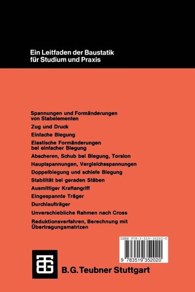 1 Spannungen und Formänderungen von Stabelementen.- 1.1 Spannungen.- 1.2 Formänderungen oder Verzerrungen von Stabelementen.- 2 Zug und Druck.- 2.1 Allgemeines.- 2.2 Zugbeanspruchung.- 2.3 Druckbeanspruchung.- 3 Einfache Biegung.- 3.1 Normalspannungen infolge eines Biegemoments.- 3.2 Trägheits- und Widerstandsmomente.- 3.3 Nutzbare Querschnitte und zulässige Biegespannungen.- 3.4 Beispiele für die Ermittlung von Trägheits- und Widerstandsmomenten.- 4 Elastische Formänderungen bei einfacher Biegung.- 4.1 Allgemeines, Biegelinie, Krümmung der Biegelinie.- 4.2 Beziehung zwischen Krümmung und Moment.- 4.3 Durchbiegung, Differentialgleichung der Biegelinie.- 4.4 Analogie von Mohr.- 4.5 Einfacher Balken auf zwei Stützen mit EI = const.- 4.6 Kragträger mit EI = const.- 4.7 Balken auf zwei Stützen mit Kragarm, EI = const.- 4.8 An beiden Enden drehbar gelagerte Träger mit Stützmomenten.- 4.9 Berechnung der Formänderungen mit Hilfe der W-Gewichte (Winkel-Gewichte).- 5 Abscheren, Schub bei Biegung, Torsion.- 5.1 Abscheren.- 5.2 Schubspannungen bei Biegung.- 5.3 Schubmittelpunkt.- 5.4 Torsion gerader Stäbe.- 6 Hauptspannungen, Vergleichsspannungen.- 6.1 Spannungen auf schrägen Schnitten bei Biegung mit Querkraft.- 6.2 Berechnung und Konstruktion der Hauptspannungen infolge von ?x und ?xz.- 6.3 Der einachsige Spannungszustand.- 6.4 Der allgemeine ebene Spannungszustand.- 6.5 Weitere Sonderfälle des ebenen Spannungszustandes, räumlicher Spannungszustand, Spannungstensor.- 6.6 Spannungstrajektorien beim Spannungszustand mit ?x und ?xz = ?zx Spannungsellipse.- 6.7 Praktische Bedeutung von Hauptspannungen und Spannungstrajektorien.- 6.8 Vergleichsspannungen.- 6.9 Anwendungen.- 7 Doppelbiegung und schiefe Biegung.- 7.1 Doppelbiegung für symmetrischeQuerschnitte.- 7.2 Zentrifugal- oder Deviationsmoment.- 7.3 Hauptachsen und Hauptträgheitsmomente. Mohrscher Trägheitskreis.- 7.4 Trägheitsellipse.- 7.5 Anwendungen.- 7.6 Schiefe Biegung.- 7.7 Anwendungen.- 8 Stabilität bei geraden Stäben.- 8.1 Wesen der Stabilität und der Stabilitätsprobleme.- 8.2 Knicken gerader, elastischer Stäbe.- 8.3 Einfluß des Baustoffverhaltens.- 8.4 Spannungsnachweis und Querschnittsbemessung einteiliger Druckstäbe.- 8.5 Knickung bei dünnwandigen, offenen Profilen.- 8.6 Spannungsnachweis und Querschnittsbemessung für mehrteilige Druckstäbe.- 8.7 Kippsicherheit von Trägern mit I-Querschnitt.- 8.8 Ausbeulen von Stegblechen.- 9 Ausmittiger Kraftangriff.- 9.1 Biegung und Zug nach Theorie I. Ordnung.- 9.2 Einführung in die Theorie II. Ordnung.- 9.3 Biegung und Druck: Ausmittiger Druck.- 9.4 Querschnittskern.- 9.5 Spannungsverteilung bei klaffender Fuge.- 9.6 Stützlinie.- 9.7 Spannungen im biegefesten Querschnitt bei beliebigem Angriffspunkt der Kraft.- 10 Eingespannte Träger.- 10.1 Einspanngrade und statische Unbestimmtheit.- 10.2 Einseitig starr eingespannter Träger.- 10.3 Beiderseits starr eingespannter Träger.- 11 Durchlaufträger.- 11.1 Allgemeines.- 11.2 Lösung nach Clapeyron.- 11.3 Momentenausgleichsverfahren nach Cross.- 11.4 Ungünstigste Laststellungen.- 11.5 Durchbiegungen.- 11.6 Winklersche Zahlen.- 11.7 Näherungsweise Berechnung durchlaufender Träger.- 11.8 Anwendungen.- 12 Unverschiebliche Rahmen nach Cross.- 12.1 Allgemeines.- 12.2 Verschieblichkeit von Rahmen.- 12.3 Rechnungsgang.- 12.4 Anwendungen.- 13 Das Reduktionsverfahren oder die Berechnung mit Übertragungsmatrizen.- 13.1 Die Übertragungsmatrix eines Stababschnitts.- 13.2 Berechnung des Einfeldträgers mit mehreren Abschnitten.- 13.3 Das Berechnen vonDurchlaufträgern auf starren Stützen mit Übertragungsmatrizen.- 13.4 Beispiel 4: Durchlaufträger auf starren Stützen.- 13.5 Durchlaufträger auf elastisch nachgiebigen Stützen.- 13.6 Beispiel 5: Durchlaufträger auf elastisch nachgiebigen Stützen.
