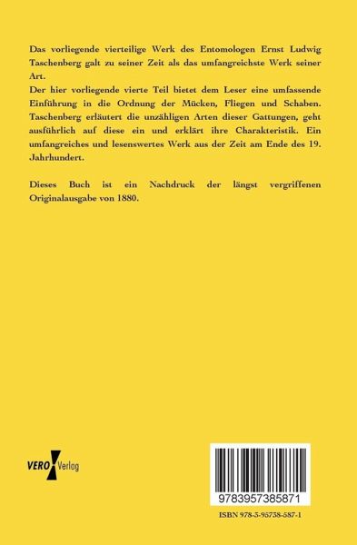 Der hier vorliegende vierte Teil bietet dem Leser eine umfassende Einführung in die Ordnung der Mücken, Fliegen und Schaben. Taschenberg erläutert die unzähligen Arten dieser Gattungen, geht ausführlich auf diese ein und erklärt ihre Charakteristik. Ein umfangreiches und lesenswertes Werk aus der Zeit am Ende des 19. Jahrhundert.