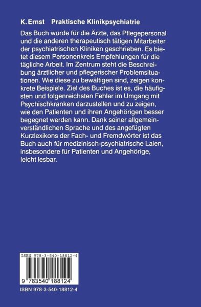 Die 2., neu bearbeitete und erweiterte Auflage dieses Buches wurde für die Ärzte, das Pflegepersonal und alle therapeutisch tätigen Mitarbeiter der psychiatrischen Kliniken geschrieben. Sie bietet diesem Personenkreis Empfehlungen für die tägliche Arbeit. Im Zentrum steht die Beschreibung ärztlicher und pflegerischer Problemsituationen. Wie diese zu bewältigen sind, zeigen konkrete Beispiele. Ziel des Buches ist es, die häufigsten und folgenreichsten Fehler im Umgang mit Psychischkranken darzustellen und zu zeigen, wie den Patienten und ihren Angehörigen besser begegnet werden kann. Dank seiner allgemeinverständlichen Sprache und des angefügten Kurzlexikons der Fach- und Fremdwörter ist das Buch auch für medizinisch-psychiatrische Laien, insbesondere für Patienten und Angehörige, leicht lesbar. Aus den Besprechungen zur 1. Auflage:"Das Buch von Professor Dr. K. Ernst kann für den Psychiatrie-Unterricht und für Stationsbesprechungen sehr empfohlen werden." Deutsche Krankenpflege-Zeitschrift#1 "Mit seinem ausgezeichneten Buch vermittelt er uns einen sehr guten Einblick in die Institution der psychiatrischen Klinik." Neue Zürcher Zeitung#2