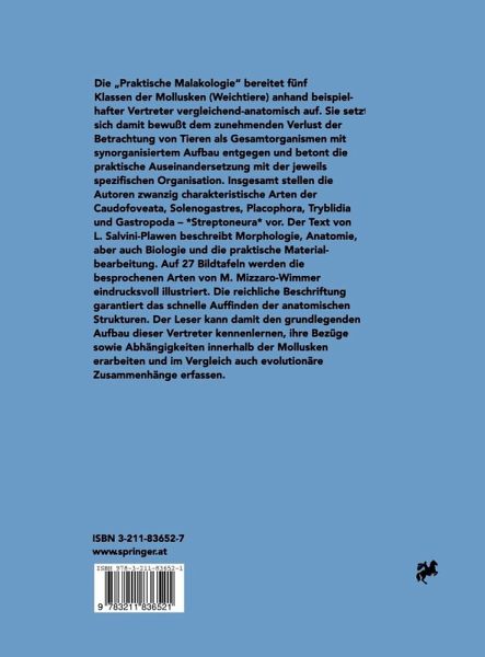 Die "Praktische Malakologie" bereitet fünf Klassen der Mollusken (Weichtiere) anhand beispielhafter Vertreter vergleichend-anatomisch auf. Sie setzt sich damit bewusst dem zunehmenden Verlust der Betrachtung von Tieren als Gesamtorganismen mit synorganisiertem Aufbau entgegen und betont die praktische Auseinandersetzung mit der jeweils spezifischen Organisation. Insgesamt stellen die Autoren zwanzig charakteristische Arten der Caudofoveata, Solenogastres, Placophora, Tryblidia und Gastropoda-*Streptoneura* vor. Der Text beschreibt Morphologie, Anatomie, aber auch Biologie und die praktische Materialbearbeitung. Auf 27 Bildtafeln werden die besprochenen Arten von Maria Mizzaro-Wimmer eindrucksvoll illustriert. Die reichliche Beschriftung garantiert das schnelle Auffinden der anatomischen Strukturen. Der Leser kann damit den grundlegenden Aufbau dieser Vertreter kennenlernen, ihre Bezüge sowie Abhängigkeiten innerhalb der Mollusken erarbeiten und im Vergleich auch evolutionäre Zusammenhänge erfassen.