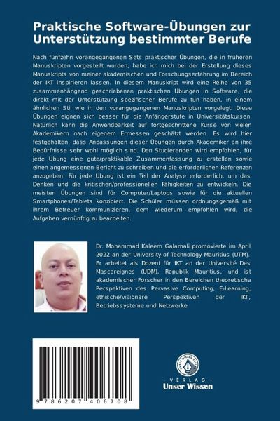 Nach fünfzehn vorangegangenen Sets praktischer Übungen, die in früheren Manuskripten vorgestellt wurden, habe ich mich bei der Erstellung dieses Manuskripts von meiner akademischen und Forschungserfahrung im Bereich der IKT inspirieren lassen. In diesem Manuskript wird eine Reihe von 35 zusammenhängend geschriebenen praktischen Übungen in Software, die direkt mit der Unterstützung spezifischer Berufe zu tun haben, in einem ähnlichen Stil wie in den vorangegangenen Manuskripten vorgelegt. Diese Übungen eignen sich besser für die Anfängerstufe in Universitätskursen. Natürlich kann die Anwendbarkeit auf fortgeschrittene Kurse von vielen Akademikern nach eigenem Ermessen geschätzt werden. Es wird hier festgehalten, dass Anpassungen dieser Übungen durch Akademiker an ihre Bedürfnisse sehr wohl möglich sind. Den Studierenden wird empfohlen, für jede Übung eine gute/praktikable Zusammenfassung zu erstellen sowie einen angemessenen Bericht zu schreiben und die erforderlichen Referenzen anzugeben. Für jede Übung ist ein Teil der Analyse erforderlich, um das Denken und die kritischen/professionellen Fähigkeiten zu entwickeln. Die meisten Übungen sind für Computer/Laptops sowie für die aktuellen Smartphones/Tablets konzipiert. Die Schüler müssen ordnungsgemäß mit ihrem Betreuer kommunizieren, dem wiederum empfohlen wird, die Aufgaben vernünftig zu bearbeiten.
