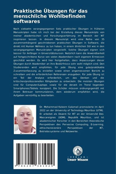 Nach siebzehn vorangegangenen Sets praktischer Übungen in früheren Manuskripten habe ich mich bei der Erstellung dieses Manuskripts von meiner akademischen und Forschungserfahrung im Bereich der IKT inspirieren lassen. In diesem Manuskript wird eine Reihe von 35 zusammenhängend geschriebenen praktischen Übungen in Software, die direkt mit Human Wellness zu tun haben, in einem ähnlichen Stil wie in den vorangegangenen Manuskripten vorgestellt. Solche Übungen eignen sich besser für Anfänger in Universitätskursen. Natürlich kann die Anwendbarkeit auf fortgeschrittene Kurse von vielen Akademikern nach eigenem Ermessen geschätzt werden. Es wird hier festgehalten, dass Anpassungen dieser Übungen durch Akademiker an ihre Bedürfnisse sehr wohl möglich sind. Den Studierenden wird empfohlen, für jede Übung eine gute/praktikable Zusammenfassung zu erstellen sowie einen angemessenen Bericht zu schreiben und die erforderlichen Referenzen anzugeben. Für jede Übung ist ein Teil der Analyse erforderlich, um das Denken und die kritischen/professionellen Fähigkeiten zu entwickeln. Die meisten Übungen sind für Computer/Laptops sowie für die derzeit im Trend liegenden Smartphones/Tablets konzipiert. Die Schüler müssen ordnungsgemäß mit ihrem Betreuer kommunizieren, dem wiederum empfohlen wird, die Aufgaben vernünftig zu bearbeiten.