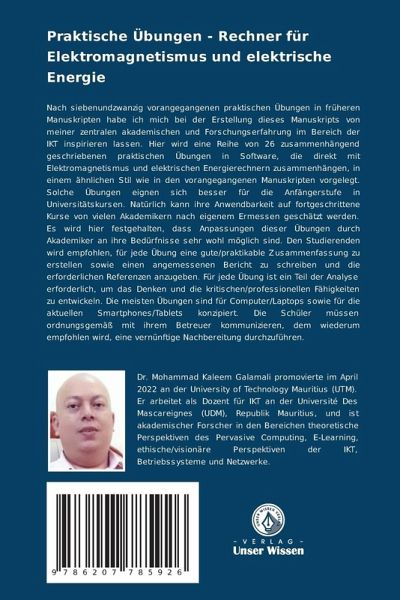 Nach siebenundzwanzig vorangegangenen praktischen Übungen in früheren Manuskripten habe ich mich bei der Erstellung dieses Manuskripts von meiner zentralen akademischen und Forschungserfahrung im Bereich der IKT inspirieren lassen. Hier wird eine Reihe von 26 zusammenhängend geschriebenen praktischen Übungen in Software, die direkt mit Elektromagnetismus und elektrischen Energierechnern zusammenhängen, in einem ähnlichen Stil wie in den vorangegangenen Manuskripten vorgelegt. Solche Übungen eignen sich besser für die Anfängerstufe in Universitätskursen. Natürlich kann ihre Anwendbarkeit auf fortgeschrittene Kurse von vielen Akademikern nach eigenem Ermessen geschätzt werden. Es wird hier festgehalten, dass Anpassungen dieser Übungen durch Akademiker an ihre Bedürfnisse sehr wohl möglich sind. Den Studierenden wird empfohlen, für jede Übung eine gute/praktikable Zusammenfassung zu erstellen sowie einen angemessenen Bericht zu schreiben und die erforderlichen Referenzen anzugeben. Für jede Übung ist ein Teil der Analyse erforderlich, um das Denken und die kritischen/professionellen Fähigkeiten zu entwickeln. Die meisten Übungen sind für Computer/Laptops sowie für die aktuellen Smartphones/Tablets konzipiert. Die Schüler müssen ordnungsgemäß mit ihrem Betreuer kommunizieren, dem wiederum empfohlen wird, eine vernünftige Nachbereitung durchzuführen.