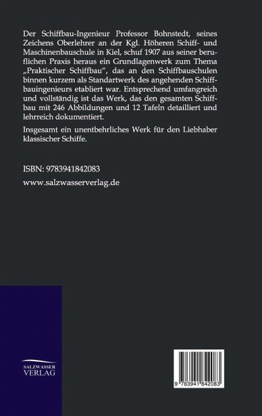 Der Schiffbau-Ingenieur Professor Bohnstedt, seines Zeichens Oberlehrer an der Kgl. Höheren Schiff- und Maschinenbauschule in Kiel, schuf 1907 aus seiner beruflichen Praxis heraus ein Grundlagenwerk zum Thema Praktischer Schiffbau , das an den Schiffbauschulen binnen kurzem als Standartwerk des angehenden Schiffbauingenieurs etabliert war. Entsprechend umfangreich und vollständig ist das Werk, das den gesamten Schiffbau mit 246 Abbildungen und 12 Tafeln detailliert und lehrreich dokumentiert.