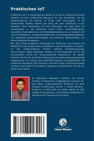 Praktisches IoT: A Comprehensive Hands-On Guide to Building Connected Systems ist eine umfassende Ressource für das Verständnis und die Implementierung von Internet of Things (IoT) Technologien. In 20 umfassenden Kapiteln beginnt das Buch mit einer Einführung in IoT-Konzepte, seine Entwicklung und sein Ökosystem und geht dann auf Anwendungen in den Bereichen Smart Cities, Gesundheitswesen, industrielle Automatisierung und Umweltüberwachung ein. Es befasst sich mit IoT-Architekturen, Hardware-Komponenten und Konnektivitätsprotokollen und beleuchtet Schlüsseltechnologien wie Sensoren, Mikrocontroller und Kommunikations-Frameworks.Das Buch bietet praktische Anleitungen für Plattformen wie Arduino und Raspberry Pi, die es dem Leser ermöglichen, reale IoT-Projekte zu erstellen. Zu den fortgeschrittenen Themen gehören IoT-Datenerfassung, Kommunikation, Edge Computing, Analytik und die Integration von KI und maschinellem Lernen für vorausschauende Erkenntnisse. Es werden kritische Themen wie Sicherheit, Datenschutz und Lebenszyklusmanagement angesprochen, um robuste und skalierbare Systeme zu gewährleisten. Mit praktischen Beispielen, Best Practices und einem Fokus auf Branchentrends ist dieses Buch ideal für Studenten, Ingenieure und Fachleute, die das IoT beherrschen wollen.
