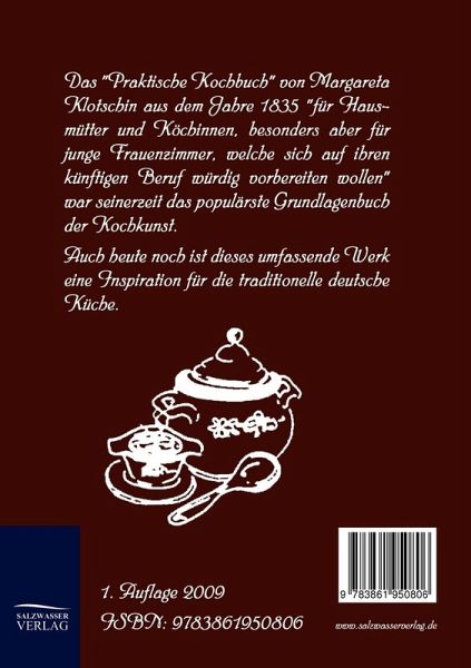 Das "Praktische Kochbuch" von Margareta Klotschin aus dem Jahre 1835 "für Hausmütter und Köchinnen, besonders aber für junge Frauenzimmer, welche sich auf ihren künftigen Beruf würdig vorbereiten wollen" war seinerzeit das allgemeingültigste Grundwerk der Kochkunst. Auch heute noch ist dieses umfassende Werk eine Inspiration für die traditionelle deutsche Küche.