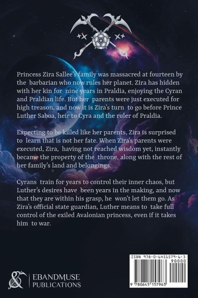 Avalonian's love for life. At fourteen, Princess Zira Sallee's family was massacred by the barbarian who now rules her planet. For the last nine years, Zira has hidden with her kin in Praldia, enjoying the Cyran and Praldian ways of life. But her parents were just executed for high treason, and now it is Zira's turn to go before Prince Luther Saboa, heir to Cyra and the ruler of Praldia. Expecting to be killed like her parents, Zira is surprised to learn that is not her fate. When Zira's parents were executed, Zira, having not reached wisdom yet, instantly became the property of the throne, along with the rest of her family's land and belongings. Cyran Elite Soldiers train for years to control their inner chaos, but Luther's desires have been in the making for a long time, and now that they are within his grasp, he won't let them go. As Zira's official state guardian, Luther means to take full control of the exiled Avalonian princess, even if it takes him to war.