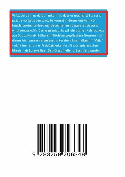 Witz, bei dem es darauf ankommt, dass er möglichst kurz und präzise vorgetragen wird, bekommt in dieser Auswahl von über hundert Gedichten ein üppigeres Gewand, wird genussvoll in Szene gesetzt. So soll ein buntes Kaleidoskop aus Spott, Komik, höherem Blödsinn, gepflegtem Nonsens - all dieses hier zusammengefasst unter dem Sammelbegriff "Witz" - nicht immer ohne Freizügigkeiten in oft wortspielerischer Manier als kurzweiliger Gemütsaufheller präsentiert werden.