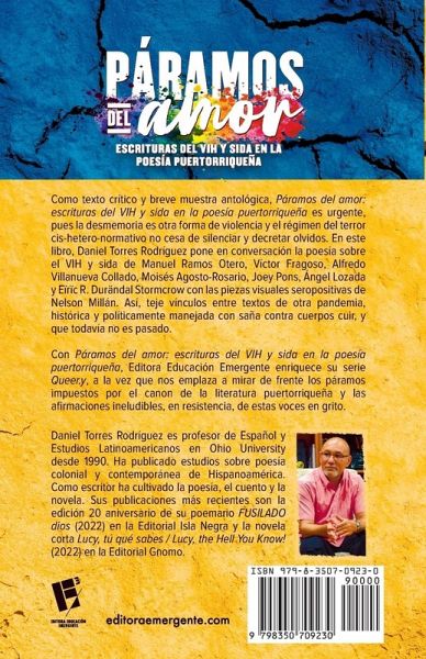 Como texto crítico y breve muestra antológica, Páramos del amor: escrituras del VIH y sida en la poesía puertorriqueñaes urgente, pues la desmemoria es otra forma de violencia y el régimen del terror cis-hetero-normativo no cesa de silenciar y decretar olvidos. En este libro, Daniel Torres Rodríguez pone en conversación la poesía sobre el VIH y sida de Manuel Ramos Otero, Víctor Fragoso, Alfredo Villanueva Collado, Moisés Agosto-Rosario, Joey Pons, Ángel Lozada y Eïrïc R. Durändal Stormcrow con las piezas visuales seropositivas de Nelson Millán. Así, teje vínculos entre textos de otra pandemia, histórica y políticamente manejada con saña contra cuerpos cuir, y que todavía no es pasado. Con Páramos del amor: escrituras del VIH y sida en la poesía puertorriqueña Editora Educación Emergente enriquece su serie Queer.y, a la vez que nos emplaza a mirar de frente los páramos impuestos por el canon de la literatura puertorriqueña y las afirmaciones ineludibles, en resistencia, de estas voces en grito.