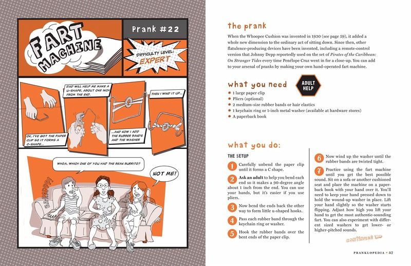 Pranklopedia is the young practical joker’s secret weapon, a boisterous collection of over 70 guaranteed-to-amuse (or annoy) pranks to be pulled on friends, siblings, and parents. Discover the Homework Hoax, the Squirting Blister, the Movie Popcorn That Grabs You Back. Pull classic pranks on your siblings, like short-sheeting the bed. Freak out your friends with food pranks: a self-peeling banana, “misfortune” cookies, or ice cream that will make them scream (here’s a hint—it involves instant mashed potatoes). And there are perfect pranks to pull on your parents, including a scheme to “freeze” the family computer. The book includes recipes for fake bird poop, fake dog poop, fake vomit, and fake snot (regular, nosebleed, and wormy varieties). Plus you’ll find 40 pages of cutout pranks: fake labels (mmm…Cream of Sparrow Soup!), a “winning” lottery ticket, bogus bathroom signs, and letters from school that will make your parents cringe. A complete prankster’s guide, Pranklopedia also provides a four-part lesson on how to pull the perfect prank and tells you what to do when pranks go bad: 1. Disappear for a while . . .