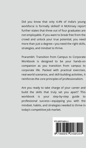 Did you know that only 4.4% of India's young workforce is formally skilled? A McKinsey report further states that three out of four graduates are not employable. If you want to break free from the crowd and unlock your true potential, you need more than just a degree-you need the right skills, strategies, and mindset to thrive. Prarambh: Transition from Campus to Corporate Workbook is designed to be your hands-on companion as you transition from campus to corporate life. Packed with practical exercises, real-world scenarios, and skill-building activities, it reinforces the core principles of professionalism. Are you ready to take charge of your career and build the skills that truly set you apart? This workbook is your step-by-step guide to professional success-equipping you with the mindset, habits, and strategies needed to thrive in today's competitive job market.