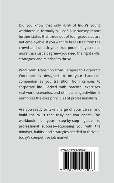 Did you know that only 4.4% of India's young workforce is formally skilled? A McKinsey report further states that three out of four graduates are not employable. If you want to break free from the crowd and unlock your true potential, you need more than just a degree-you need the right skills, strategies, and mindset to thrive. Prarambh: Transition from Campus to Corporate Workbook is designed to be your hands-on companion as you transition from campus to corporate life. Packed with practical exercises, real-world scenarios, and skill-building activities, it reinforces the core principles of professionalism. Are you ready to take charge of your career and build the skills that truly set you apart? This workbook is your step-by-step guide to professional success-equipping you with the mindset, habits, and strategies needed to thrive in today's competitive job market.