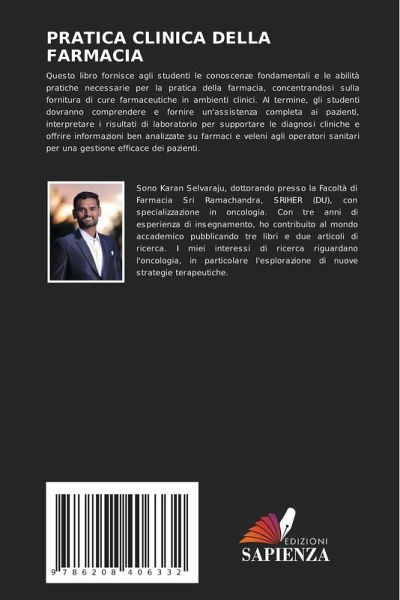 Questo libro fornisce agli studenti le conoscenze fondamentali e le abilità pratiche necessarie per la pratica della farmacia, concentrandosi sulla fornitura di cure farmaceutiche in ambienti clinici. Al termine, gli studenti dovranno comprendere e fornire un'assistenza completa ai pazienti, interpretare i risultati di laboratorio per supportare le diagnosi cliniche e offrire informazioni ben analizzate su farmaci e veleni agli operatori sanitari per una gestione efficace dei pazienti.