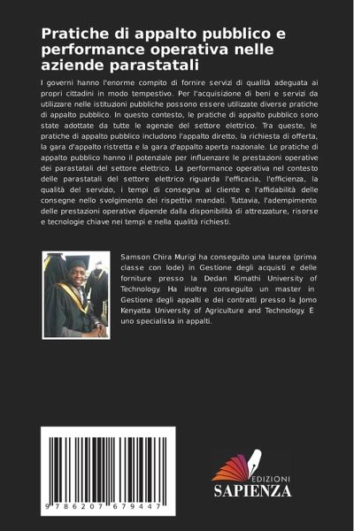 I governi hanno l'enorme compito di fornire servizi di qualità adeguata ai propri cittadini in modo tempestivo. Per l'acquisizione di beni e servizi da utilizzare nelle istituzioni pubbliche possono essere utilizzate diverse pratiche di appalto pubblico. In questo contesto, le pratiche di appalto pubblico sono state adottate da tutte le agenzie del settore elettrico. Tra queste, le pratiche di appalto pubblico includono l'appalto diretto, la richiesta di offerta, la gara d'appalto ristretta e la gara d'appalto aperta nazionale. Le pratiche di appalto pubblico hanno il potenziale per influenzare le prestazioni operative dei parastatali del settore elettrico. La performance operativa nel contesto delle parastatali del settore elettrico riguarda l'efficacia, l'efficienza, la qualità del servizio, i tempi di consegna al cliente e l'affidabilità delle consegne nello svolgimento dei rispettivi mandati. Tuttavia, l'adempimento delle prestazioni operative dipende dalla disponibilità di attrezzature, risorse e tecnologie chiave nei tempi e nella qualità richiesti.