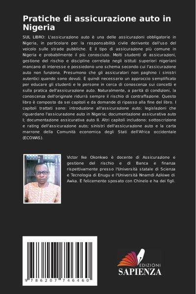 SUL LIBRO: L'assicurazione auto è una delle assicurazioni obbligatorie in Nigeria, in particolare per la responsabilità civile derivante dall'uso del veicolo sulle strade pubbliche. È il tipo di assicurazione più comune in Nigeria e probabilmente il più conosciuto. Molti studenti di assicurazioni, gestione del rischio e discipline correlate negli istituti superiori nigeriani mancano di interesse e possiedono uno schema secondo cui l'assicurazione auto non funziona. Presumono che gli assicuratori non paghino i sinistri autentici quando sono dovuti. È quindi necessario un approccio semplificato per educare gli studenti e le persone in cerca di conoscenza sui concetti e sulla pratica dell'assicurazione auto. Naturalmente, a parità di condizioni, la conoscenza dell'originale ridurrà sempre il rischio di contraffazione. Questo libro è composto da sei capitoli e da domande di ripasso alla fine del libro. I capitoli trattati sono: introduzione all'assicurazione auto; legislazioni che riguardano l'assicurazione auto in Nigeria; documentazione assicurativa auto I; documentazione assicurativa auto II. Altri capitoli includono: sottoscrizione e rating dell'assicurazione auto; sinistri dell'assicurazione auto e la carta marrone della Comunità economica degli Stati dell'Africa occidentale (ECOWAS).