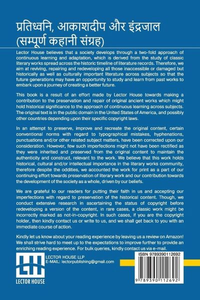 Pratidhwani, Aakashdeep Aur Indrajaal (Sampoorna Kahani Sangraha): Pratidhwani (Kahani Sangraha), Aakashdeep(Kahani Sangraha), Indrajaal (Kahani Sangraha) This book is a result of an effort made by us towards making a contribution to the preservation and repair of original classic literature. In an attempt to preserve, improve and recreate the original content, we have worked towards: 1. Type-setting & Reformatting: The complete work has been re-designed via professional layout, formatting and type-setting tools to re-create the same edition with rich typography, graphics, high quality images, and table elements, giving our readers the feel of holding a 'fresh and newly' reprinted and/or revised edition, as opposed to other scanned & printed (Optical Character Recognition - OCR) reproductions. 2. Correction of imperfections: As the work was re-created from the scratch, therefore, it was vetted to rectify certain conventional norms with regard to typographical mistakes, hyphenations, punctuations, blurred images, missing content/pages, and/or other related subject matters, upon our consideration. Every attempt was made to rectify the imperfections related to omitted constructs in the original edition via other references. However, a few of such imperfections which could not be rectified due to intentional\unintentional omission of content in the original edition, were inherited and preserved from the original work to maintain the authenticity and construct, relevant to the work. We believe that this work holds historical, cultural and/or intellectual importance in the literary works community, therefore despite the oddities, we accounted the work for print as a part of our continuing effort towards preservation of literary work and our contribution towards the development of the society as a whole, driven by our beliefs. We are grateful to our readers for putting their faith in us and accepting our imperfections with regard to preservation of the historical content. HAPPY READING!